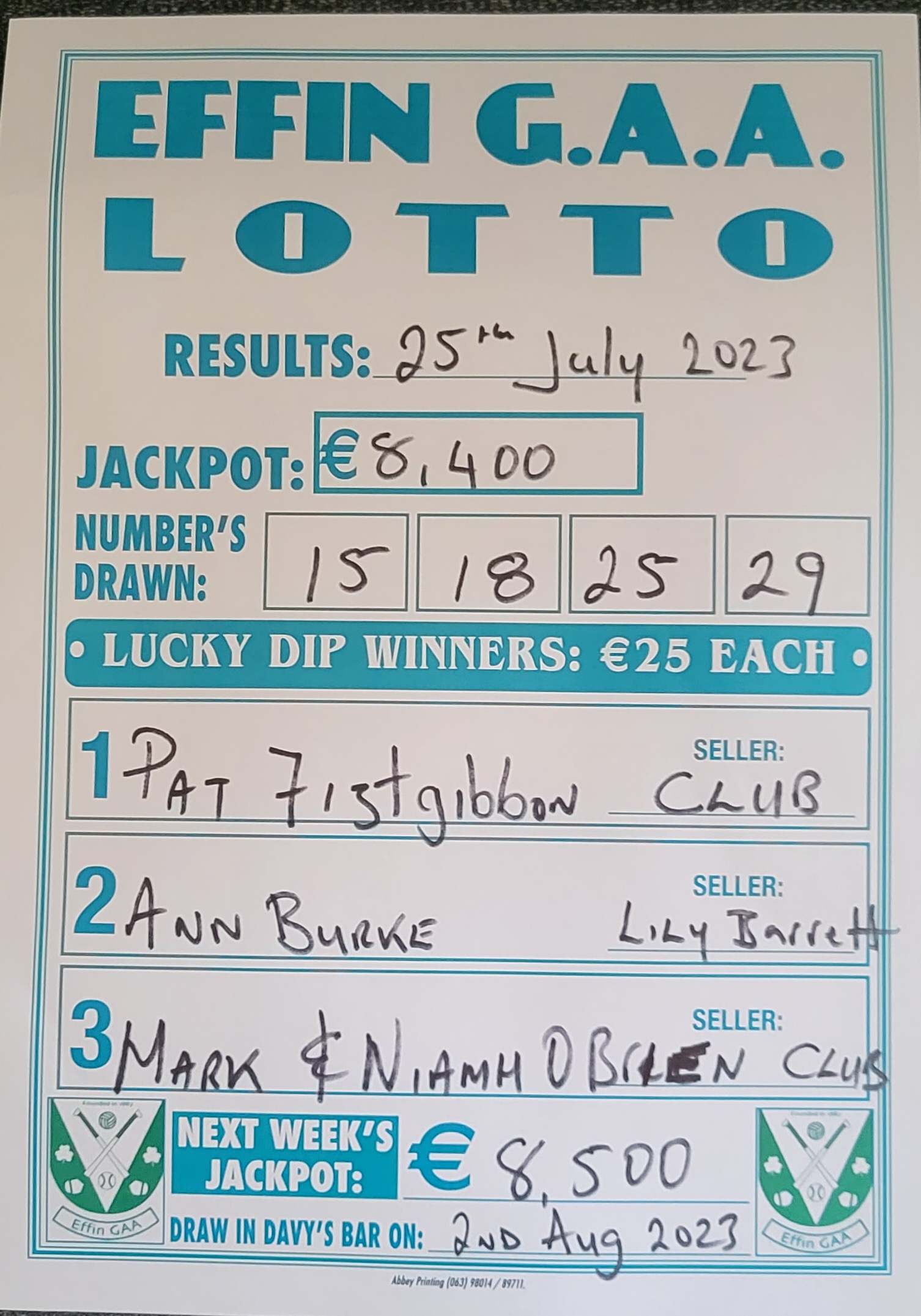 Effin GAA Lotto Results 25th july 2023 Very well made.