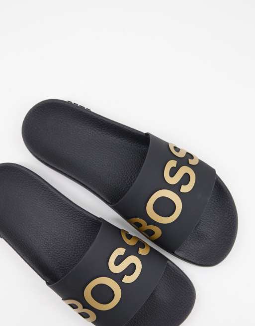BOSS Bay sliders in black gold ASOS Very well made.